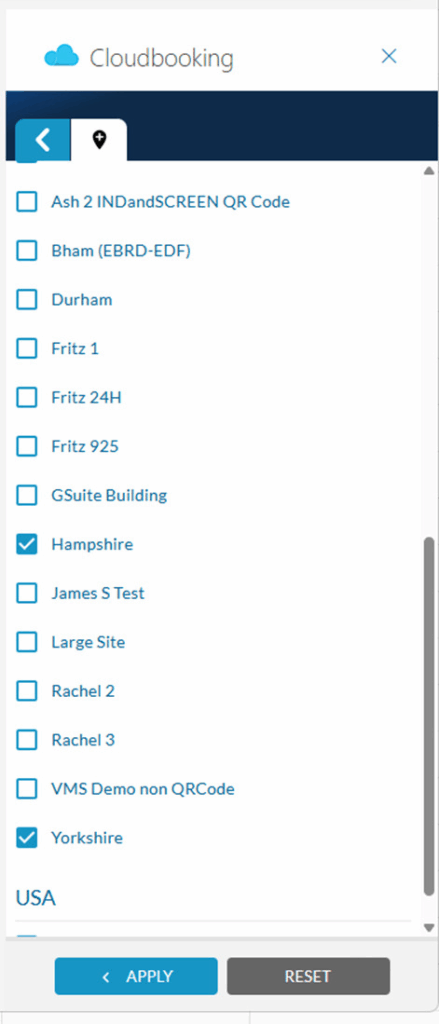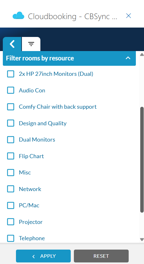 To filter rooms by available resources, click ‘Filter’, select the resources you need, and click ‘Apply’. Suitable rooms will now be listed.