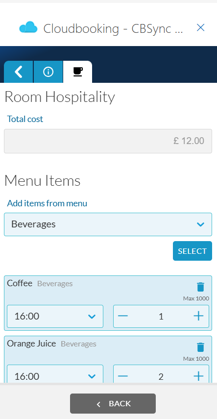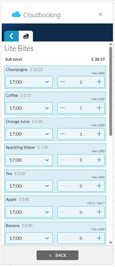 Select the items you wish to add by selecting the ‘+’ on the line item or typing the quantity in directly. You can change the delivery time of items by changing the time in the dropdown on the let. Click ‘Back’ once the menu items have been selected.