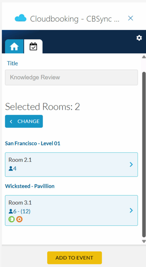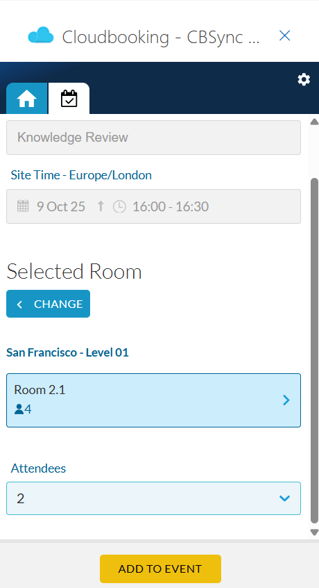 Complete all the required fields on the booking form, then select ‘Add to Event’ at the bottom of the screen to add the room to the location field on the invite.