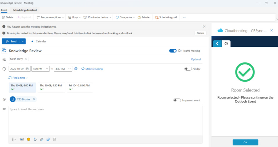 PLEASE NOTE: You must send the Outlook invite in order for the booking to be completed successfully.