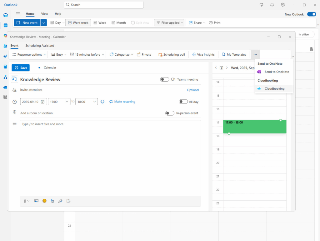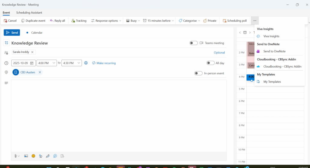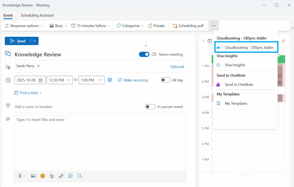 Open your Outlook calendar invite, then open the Cloudbooking add-in.