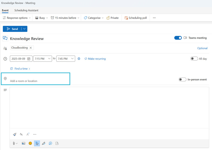 Once saved in the add-in the rooms will be added to the ‘Location’ field on the