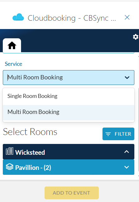 Once the add-in is open select the drop down under ‘Service’ and select ‘Multi Room Booking’.