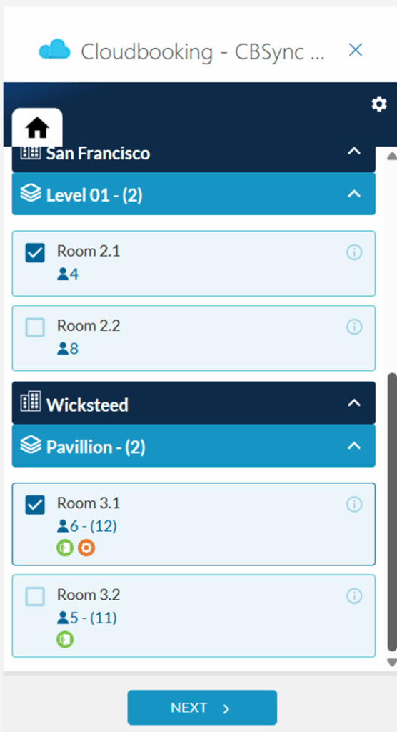 Once selected, the add-in will open. All available rooms for the site you have selected will also be shown. The capacity of each room is displayed under the room name, next to the person icon.