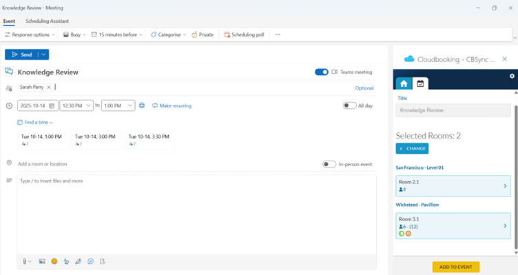 Add the title of your meeting, all attendees and set the date and time. Then launch the Cloudbooking Add-In icon to find a suitable room.