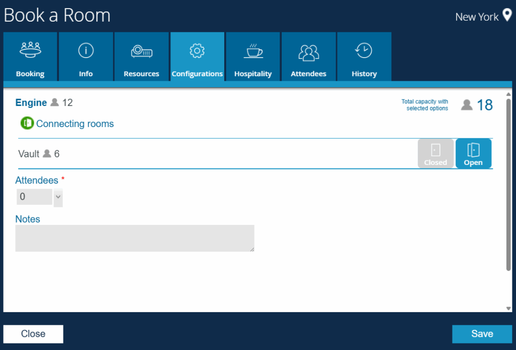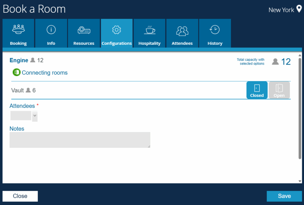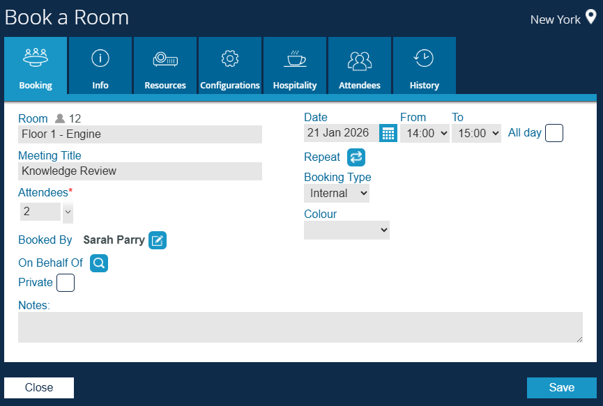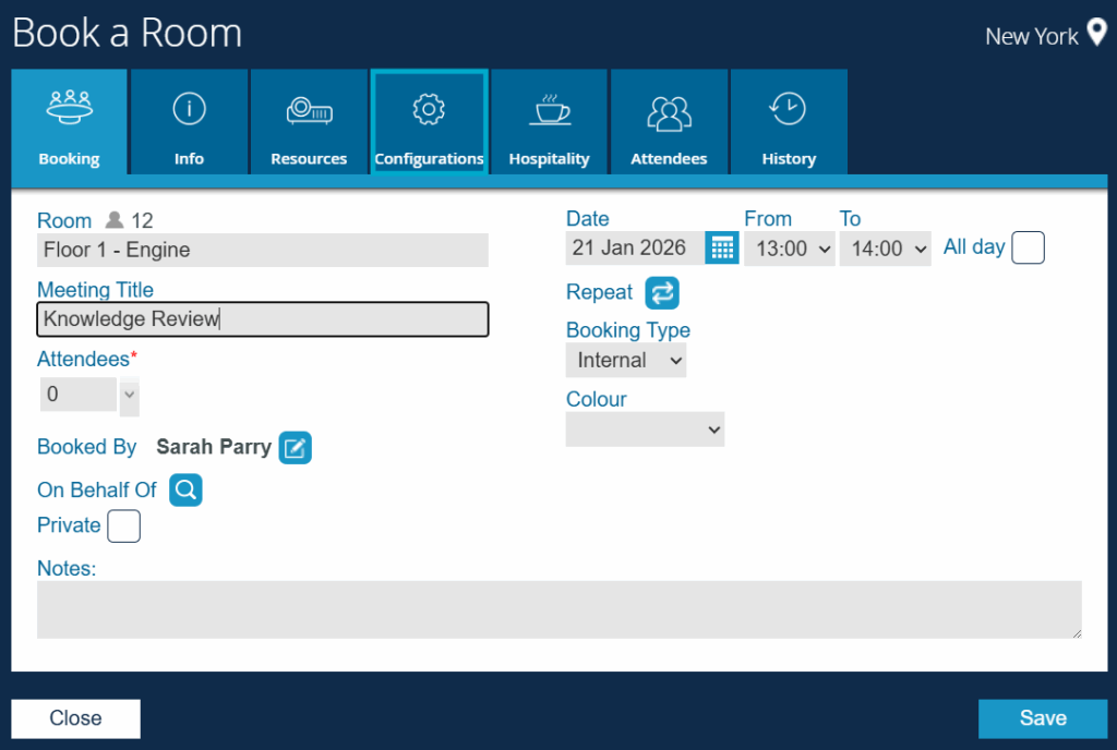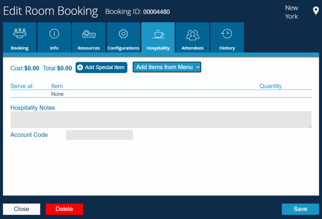 You will now have the ability to book your room, resource, room configurations, hospitality & attendee requirements.
