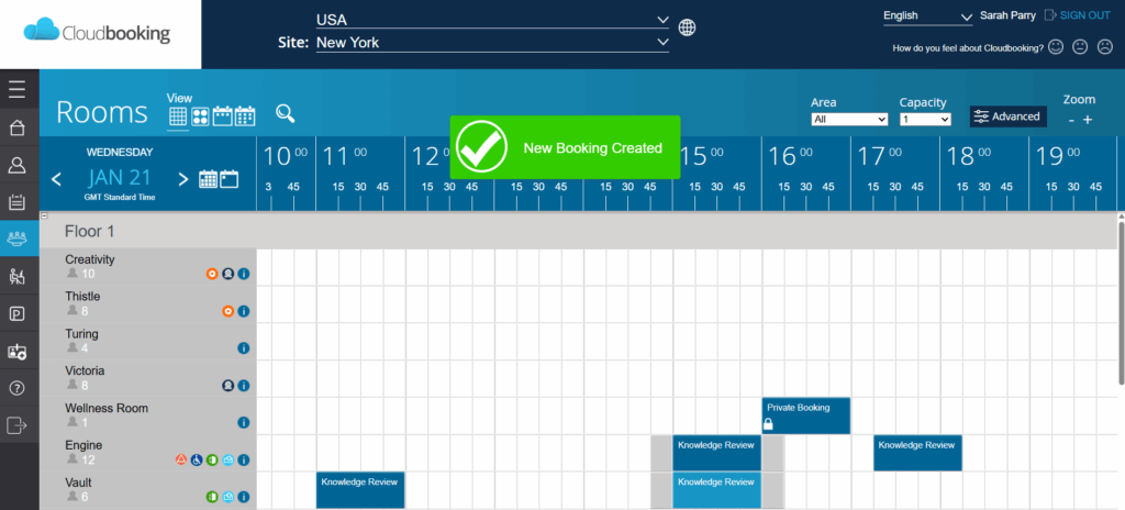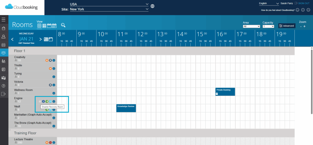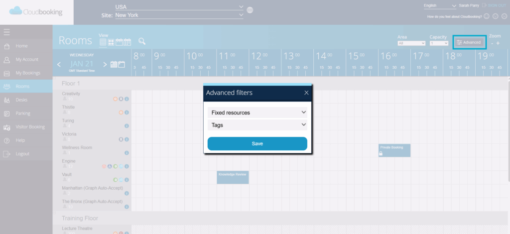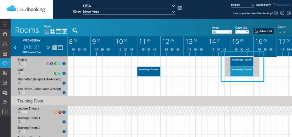 Select the date required (you can also select a preferred floor/area/capacity/ to refine the table) and you can then see the available times and click and drag the slot you want on the table. There is also the option to refine your room selection further by clicking ‘Advanced’