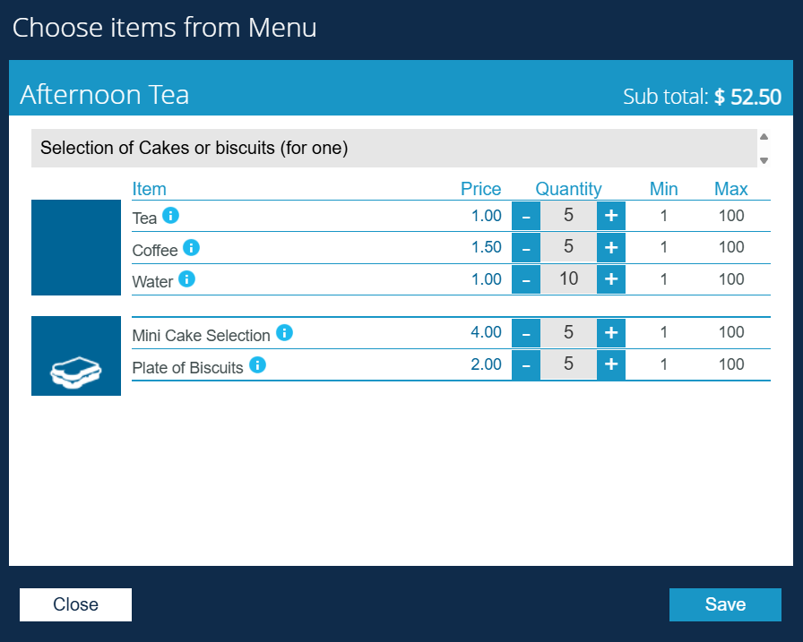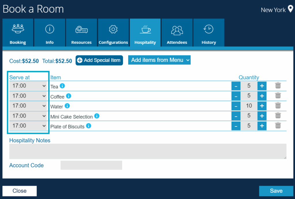 Once added you will see the items on the hospitality screen. From there you can decide what time you would like the items to be delivered during the booking by selecting the drop down under Serve at for each line item.