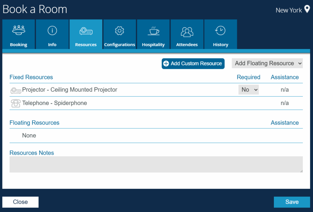 This tab will show you all fixed resources and if floating resources are available selecting the drop down for Add Floating Resource will show a list of what is available and allow you to select what you would like. Once you’re happy with your selections select Save to complete the booking.