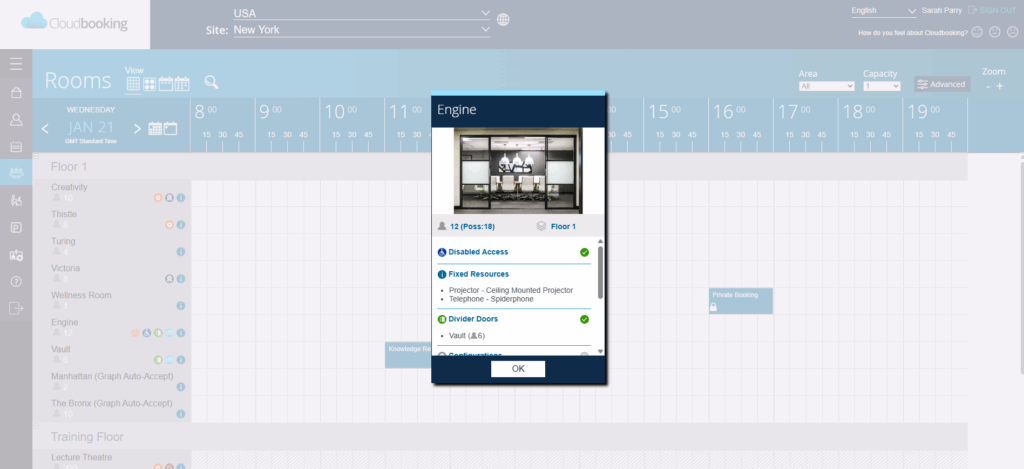 Clicking on the ‘Information’ icon brings up a more detailed description of the room and its features.